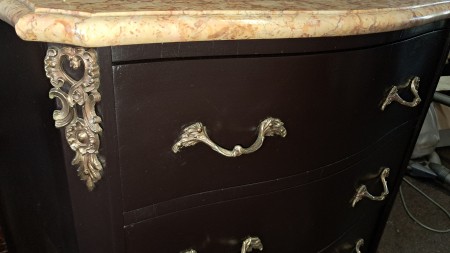 le plateau recouvert d'un marbre mouvementé bordé d'un bec de corbin en brocatelle beige.