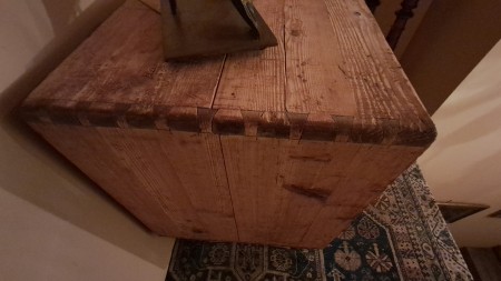 batie en sapin brut , les quatre angles montés à queues d'aronde sur toute la longueur.