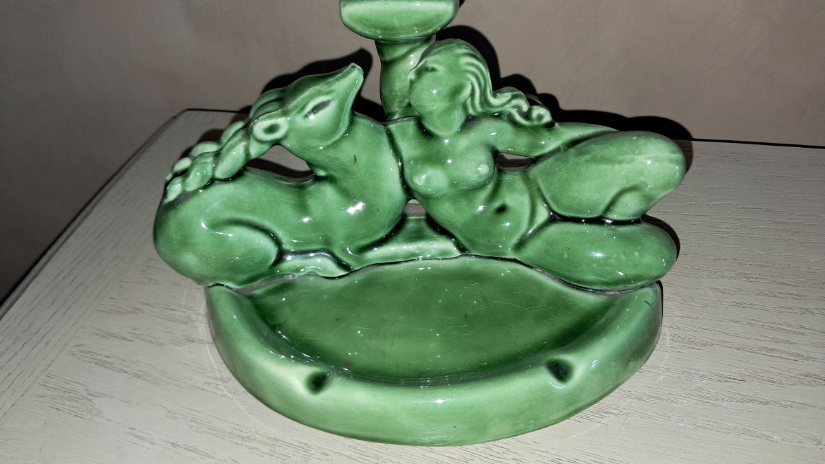 Petite lampe en céramique verte typique des années 40 formant vide-poche.